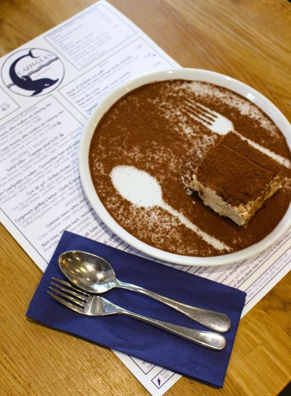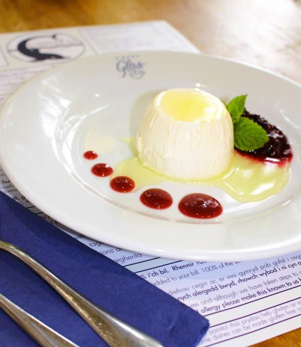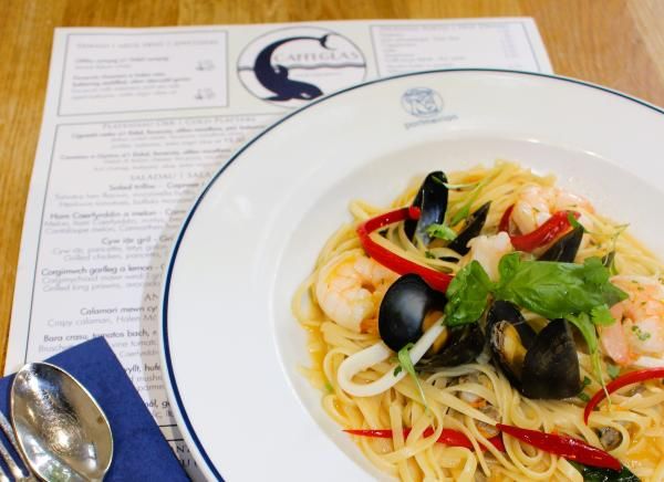 Caffi Glas has seating inside, and outside on the Caffi Piazza, with its four classical caryatids, (one by Jonah Jones), a dolphin fountain by J M Blashfield, and large Warwick vase by mark Blanchard at the centre.
