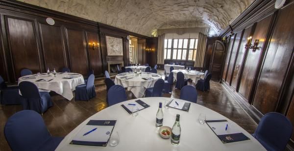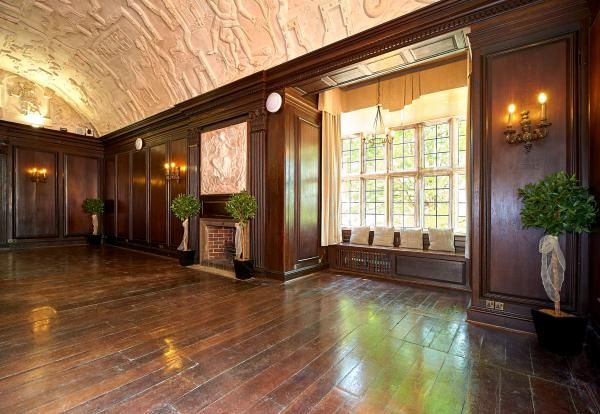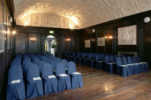 Our main Hercules Hall located in the Village Centre makes a spectacular setting for large conferences, celebrations, and parties. The room enjoys a central location with high ceilings and access to our private terrace. Located in the Town Hall, Hercules Hall can host anywhere from 30 - 150 guests. Boasting a stunning Jacobean ceiling, this white barrel-vaulted hall features dark wood panelling and mullioned windows.